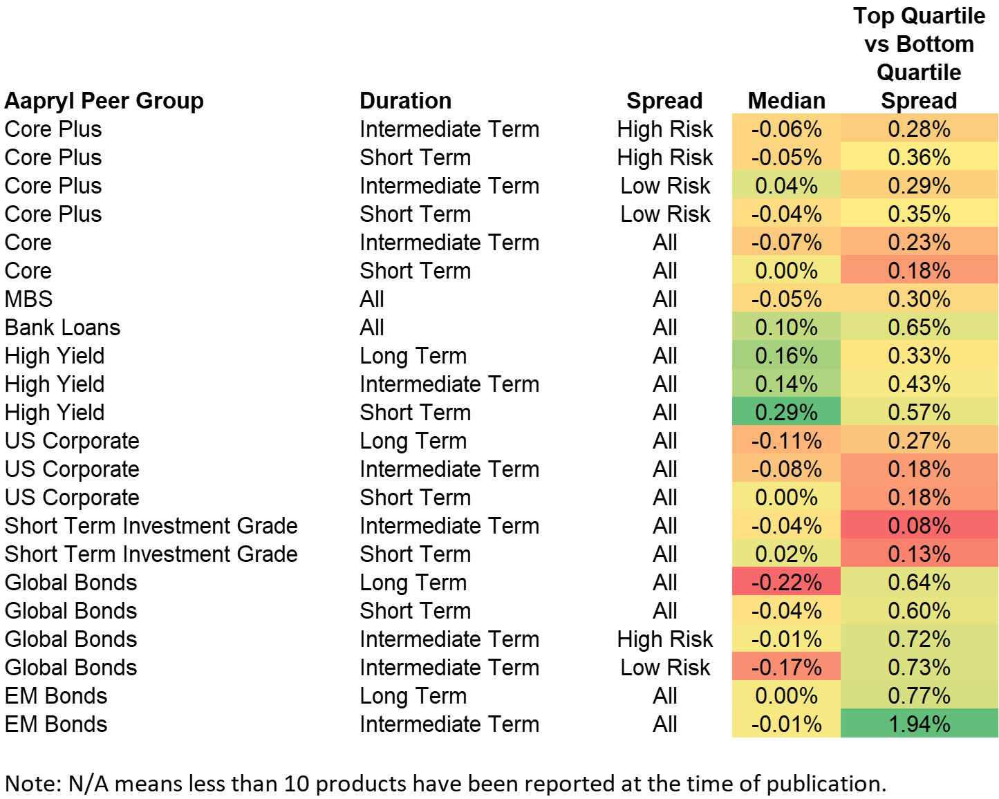 Active managers in Fixed Income continue to show performance differences between top and bottom quartile managers. The highest spread this quarter continued to be in EM Bond Intermediate Term All Spread 1.94% (previous quarter was 1.31%), while Short Investment Grade Intermediate Term All Spread Risk had the lowest spread of 0.08% (previous quarter was 0.19%). The High Yield Short Term All Spread median managers performed the best with +0.29%, while Global Bond Long Term All Spread performed the worst during the quarter with -0.22% median return.